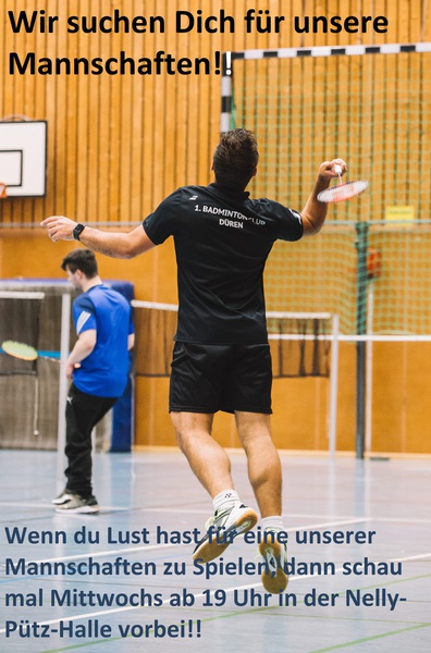 Der 1. Badminton-Club-Düren 57 e.V. sucht Spieler und vor allem Spielerinnen für seine Senioren Teams und um weitere Mannschaften aufzustellen. Die Anfrage richtet sich an alle Badminton Spieler die gerne in einer Mannschaft an den Punktspielrunden teilnehmen möchten. Die 2. Mannschaft tritt in der kommenden Saison in der Bezirksliga an, die 3. Mannschaft spielt in der Kreisliga. Gerne würden wir auch weitere Mannschaften für den Spielbetrieb melden.