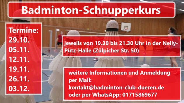 Weitere Informationen und Anmeldungen zum Kurs bitte per Mail an: kontakt@badminton-club-dueren.de oder per WhatsApp: 01715869677.