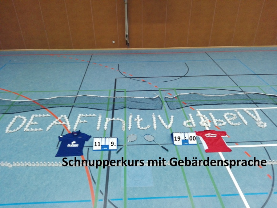 Am 11.09.2019 bietet der 1. BC Düren in Kooperation mit lioOon, im Rahmen einer „DEAFinitiv dabei!“-Aktion, einen kostenlosen Badminton-Schnupperkurs mit Gebärdensprache an.