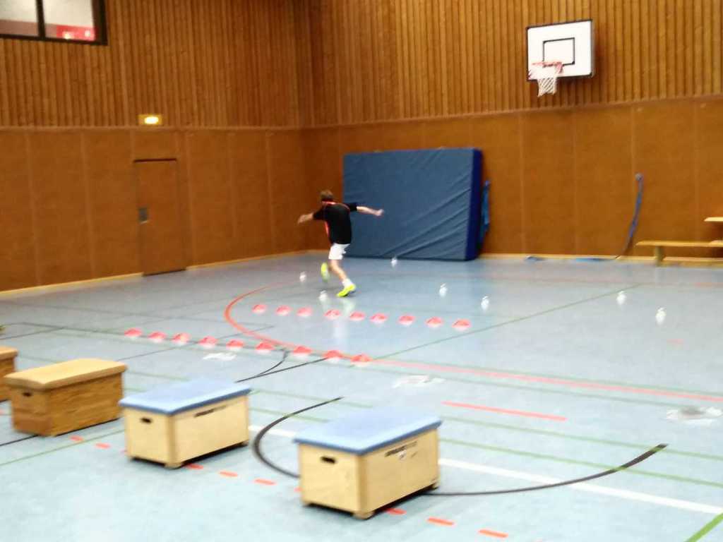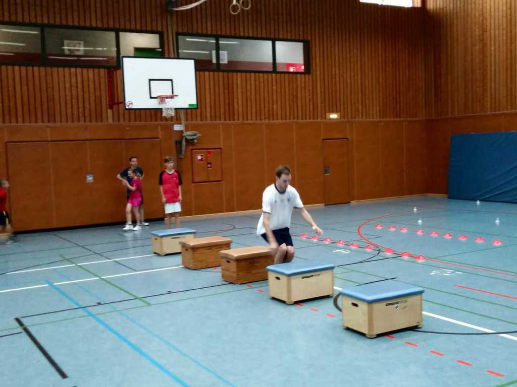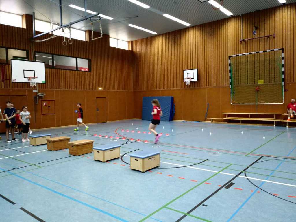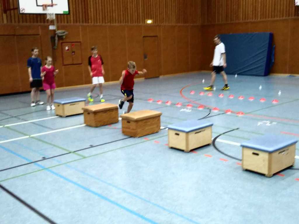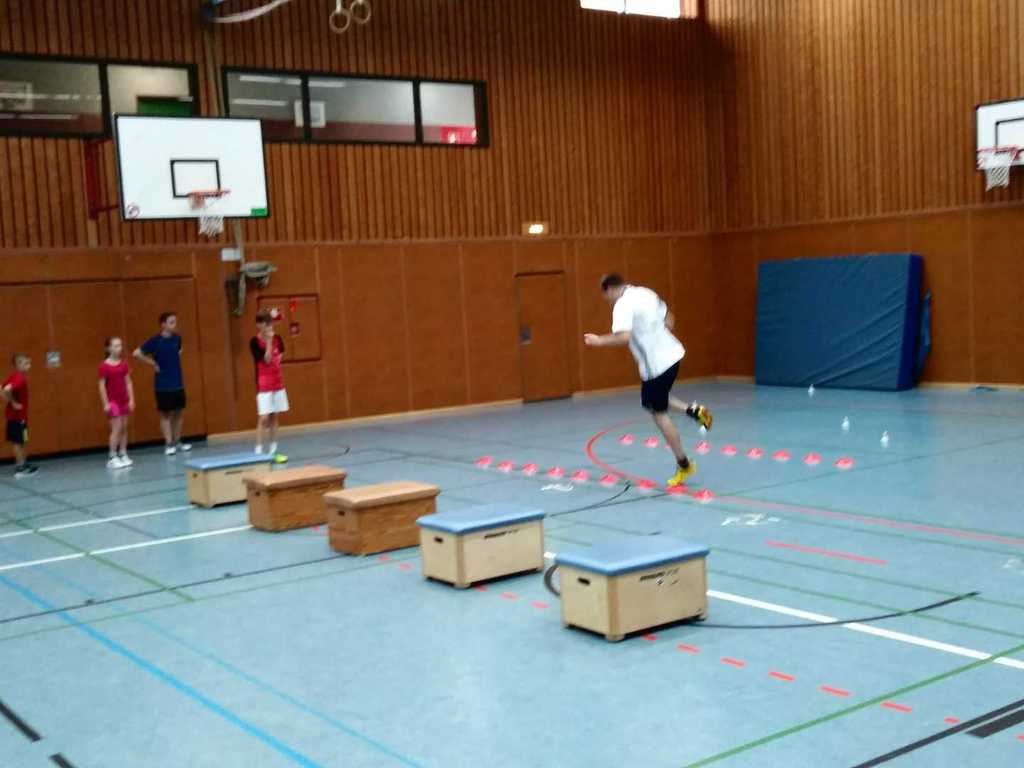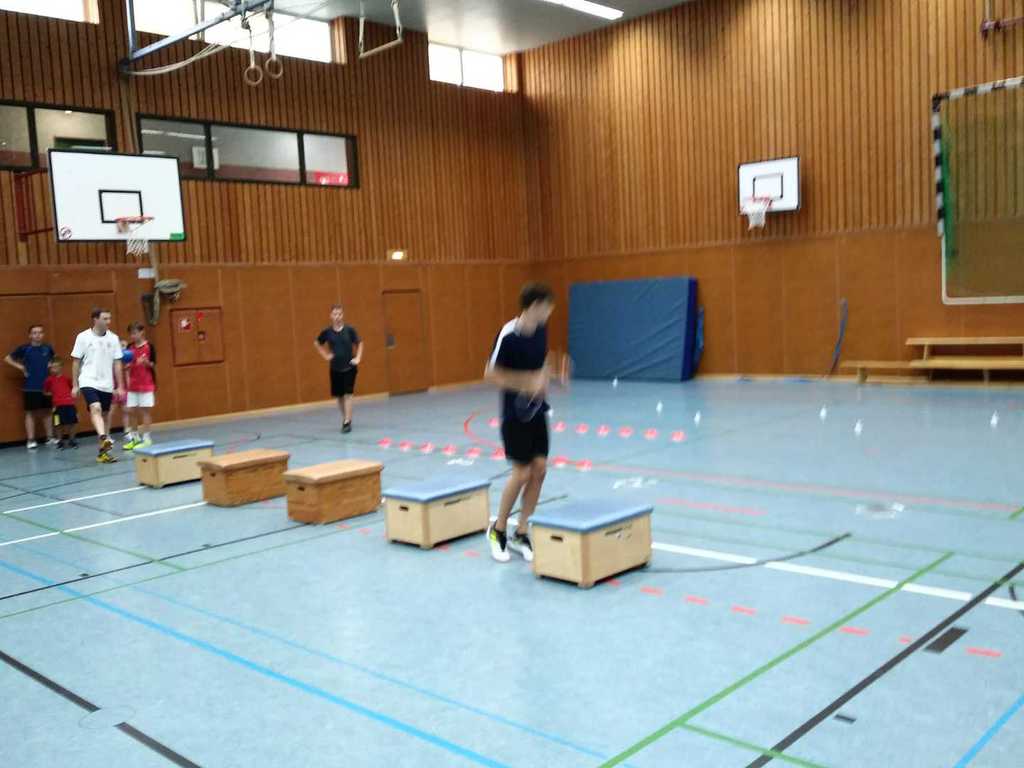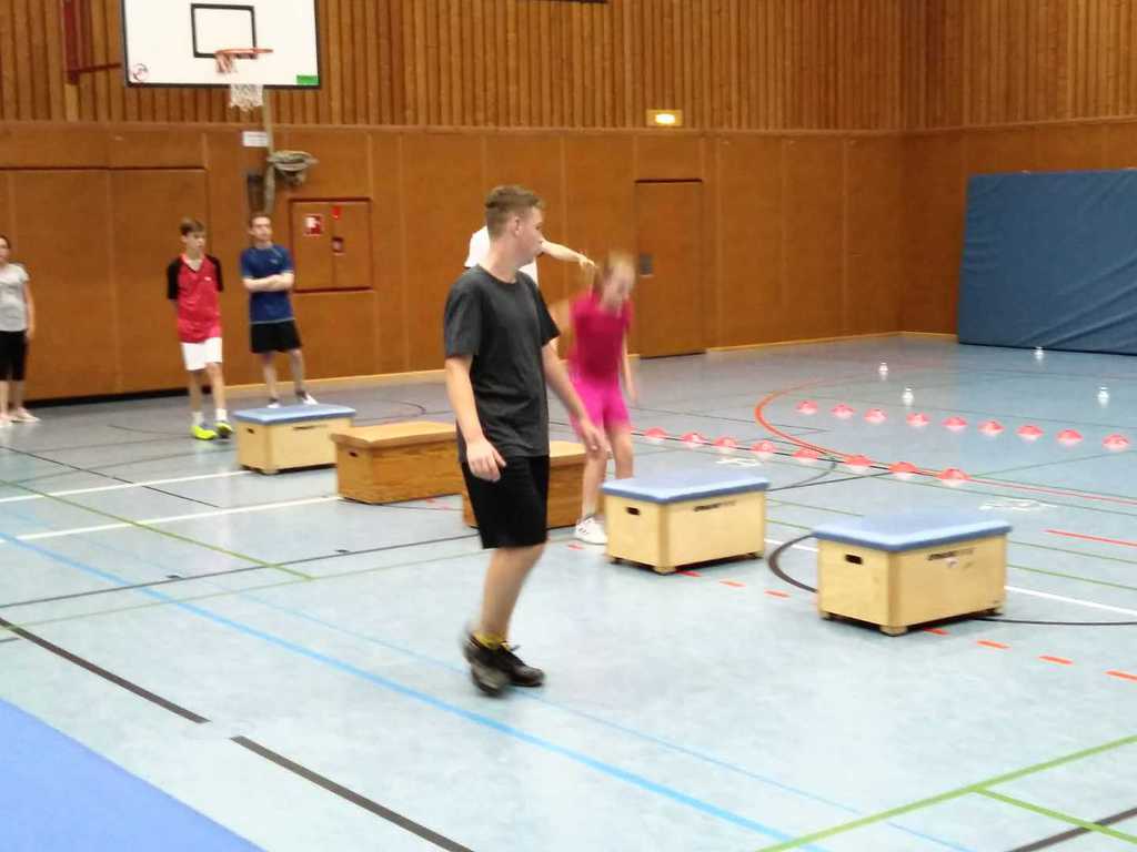 Danach wurden die Netze aufgebaut und auf 4 Feldern ein Spiel im Mini-Mannschaftssystem gemacht. Dies bedeutete es gab zwei Doppel und vier Einzel. Über eine Stunde hatte es gedauert bis alle Spiele durch wahren. Zwei Jugendliche haben in einem Einzel alles gegeben und in drei Sätzen um den Sieg gekämpft. Insgesamt ging das Spiel 3:3 aus. Nach einer kleinen Pause ging es mit einem Parcours weiter, der es zumindest für die kleinen in sich hatte. Los ging es mit Springen über kleine Kästen, dann einmal hüpfen auf dem linken Bein zwischen Hütchen und das gleiche mit dem rechten, dann Ausfallschritte und zum Schluss auch noch Sprinten. Jede Gruppe musste auf Zeit einmal dadurch und wurde erneut von Jonas unterstützt. Nach Strafzeiten und einigen sehr spannenden Diskussionen (weil jede Gruppe gewinnen wollte) kam es zu einem scheinbaren ungleichen Stechen. Der größte lief gegen den kleinsten und dann auch noch mit Medizinbällen (unterschiedlich schwer für die Fairness). Doch waren sich alle ziemlich einig, dass es ein ungleiches Duell ist, was aber die Zeit nicht belegte. Der älteste begann und legte eine Zeit von 20 sek. vor. Doch dann kam der kleine 7 jährige und wurde ziemlich laut von seiner Gruppe angefeuert und schaffte den gleichen Parcours in 22 sek., was einige Bonuspunkte brachte, weil die Gruppe ihn bis zuletzt angefeuert hatte. Zum Schluss wurden noch zwei Partien Völkerball gespielt. Am Ende waren alle ziemlich ausgepowert, hatten aber den Tag über sehr viel Spaß. Nach dem sportlichen Teil kam der gemütliche Teil nach knapp 3,5 Stunden wurde gegrillt.