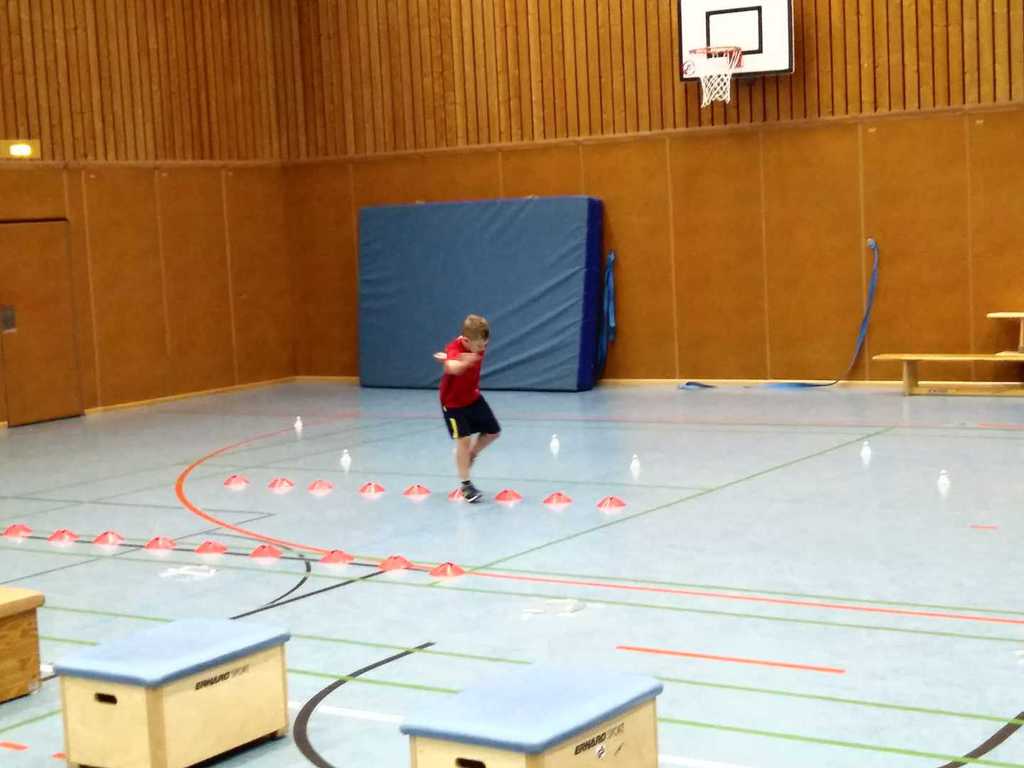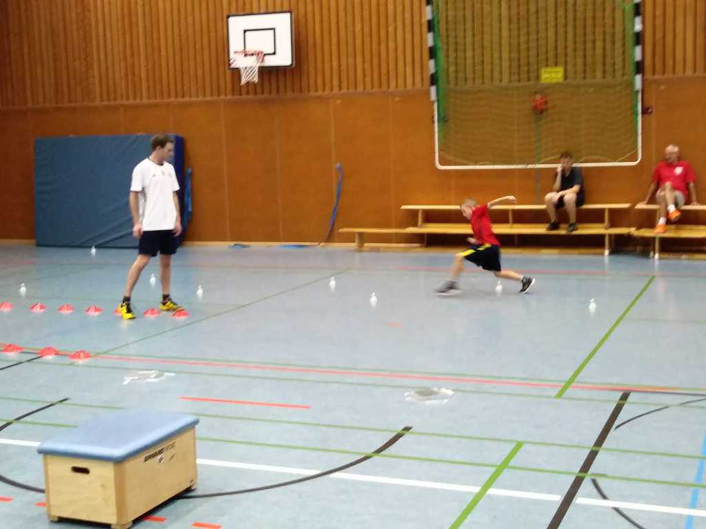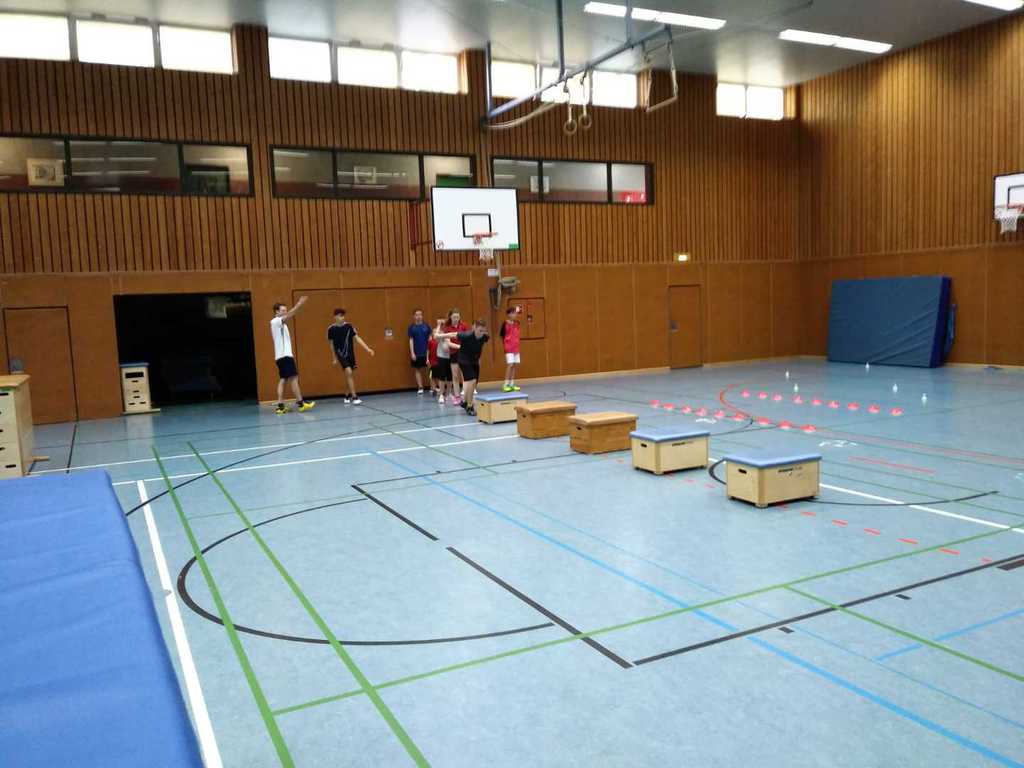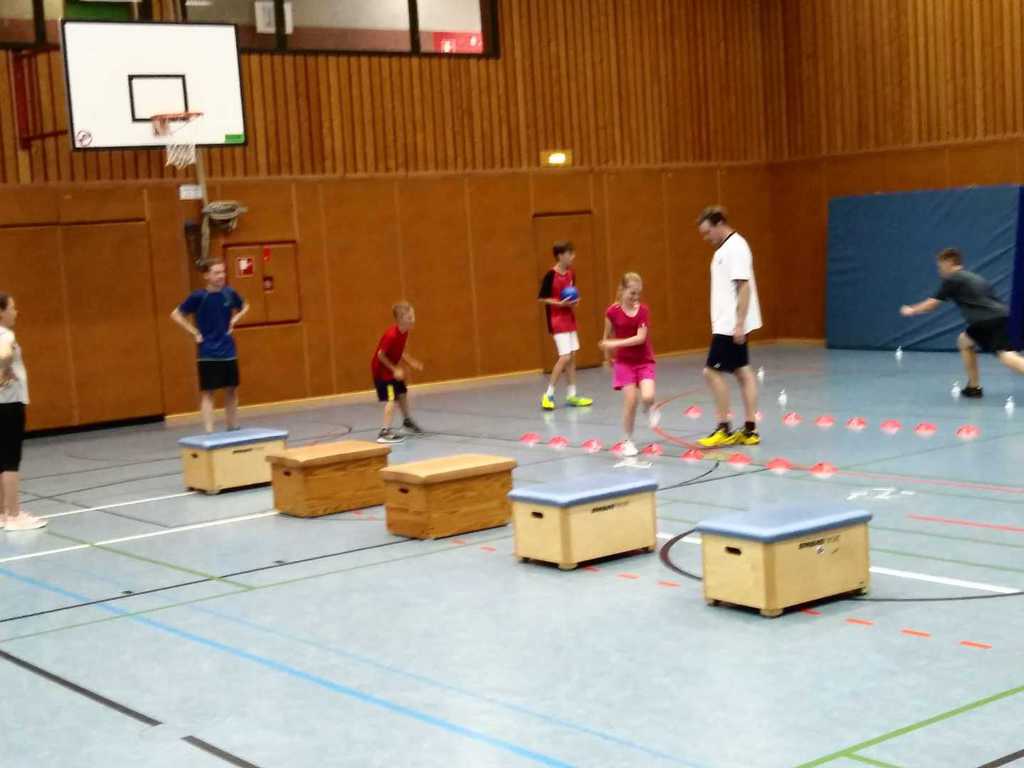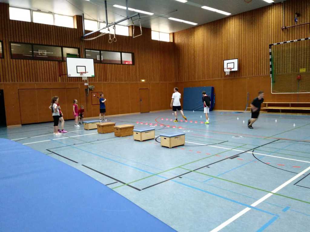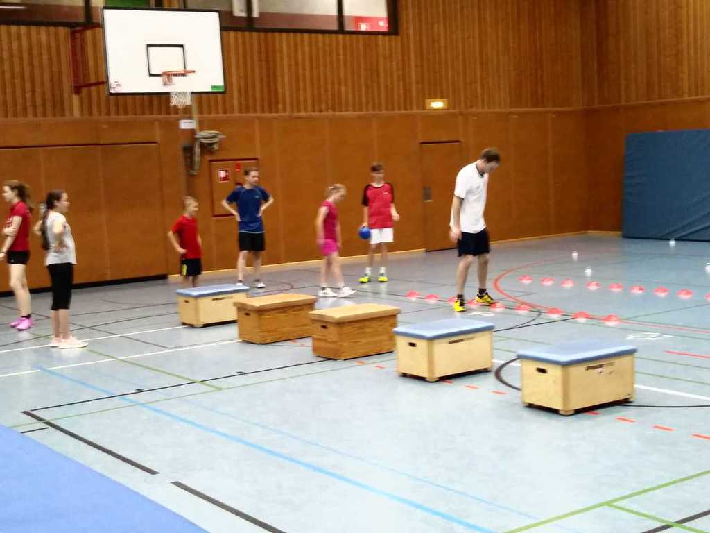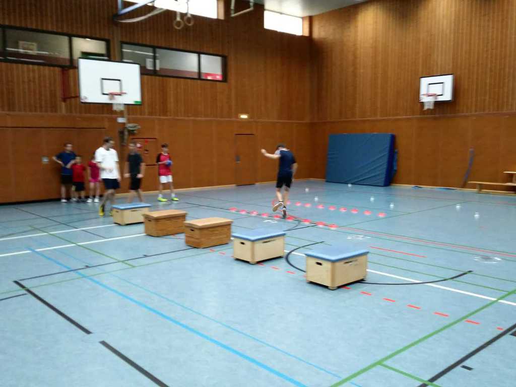 Danach wurden die Netze aufgebaut und auf 4 Feldern ein Spiel im Mini-Mannschaftssystem gemacht. Dies bedeutete es gab zwei Doppel und vier Einzel. Über eine Stunde hatte es gedauert bis alle Spiele durch wahren. Zwei Jugendliche haben in einem Einzel alles gegeben und in drei Sätzen um den Sieg gekämpft. Insgesamt ging das Spiel 3:3 aus. Nach einer kleinen Pause ging es mit einem Parcours weiter, der es zumindest für die kleinen in sich hatte. Los ging es mit Springen über kleine Kästen, dann einmal hüpfen auf dem linken Bein zwischen Hütchen und das gleiche mit dem rechten, dann Ausfallschritte und zum Schluss auch noch Sprinten. Jede Gruppe musste auf Zeit einmal dadurch und wurde erneut von Jonas unterstützt. Nach Strafzeiten und einigen sehr spannenden Diskussionen (weil jede Gruppe gewinnen wollte) kam es zu einem scheinbaren ungleichen Stechen. Der größte lief gegen den kleinsten und dann auch noch mit Medizinbällen (unterschiedlich schwer für die Fairness). Doch waren sich alle ziemlich einig, dass es ein ungleiches Duell ist, was aber die Zeit nicht belegte. Der älteste begann und legte eine Zeit von 20 sek. vor. Doch dann kam der kleine 7 jährige und wurde ziemlich laut von seiner Gruppe angefeuert und schaffte den gleichen Parcours in 22 sek., was einige Bonuspunkte brachte, weil die Gruppe ihn bis zuletzt angefeuert hatte. Zum Schluss wurden noch zwei Partien Völkerball gespielt. Am Ende waren alle ziemlich ausgepowert, hatten aber den Tag über sehr viel Spaß. Nach dem sportlichen Teil kam der gemütliche Teil nach knapp 3,5 Stunden wurde gegrillt.