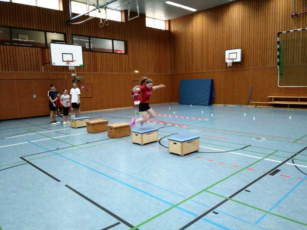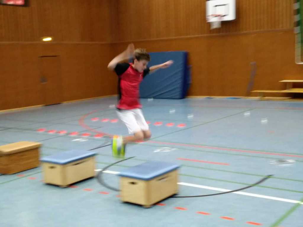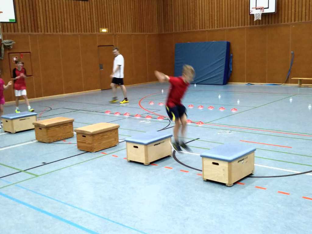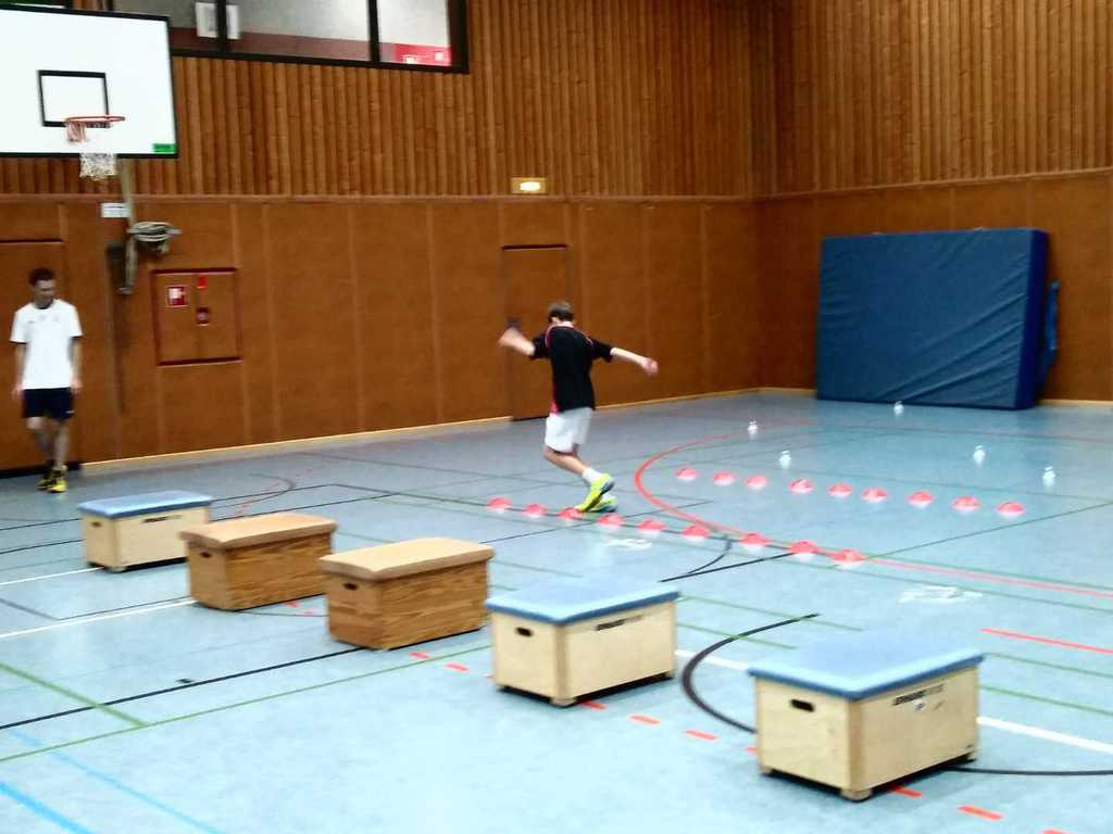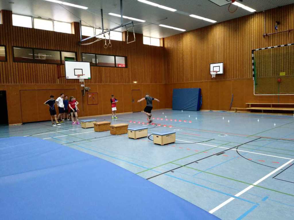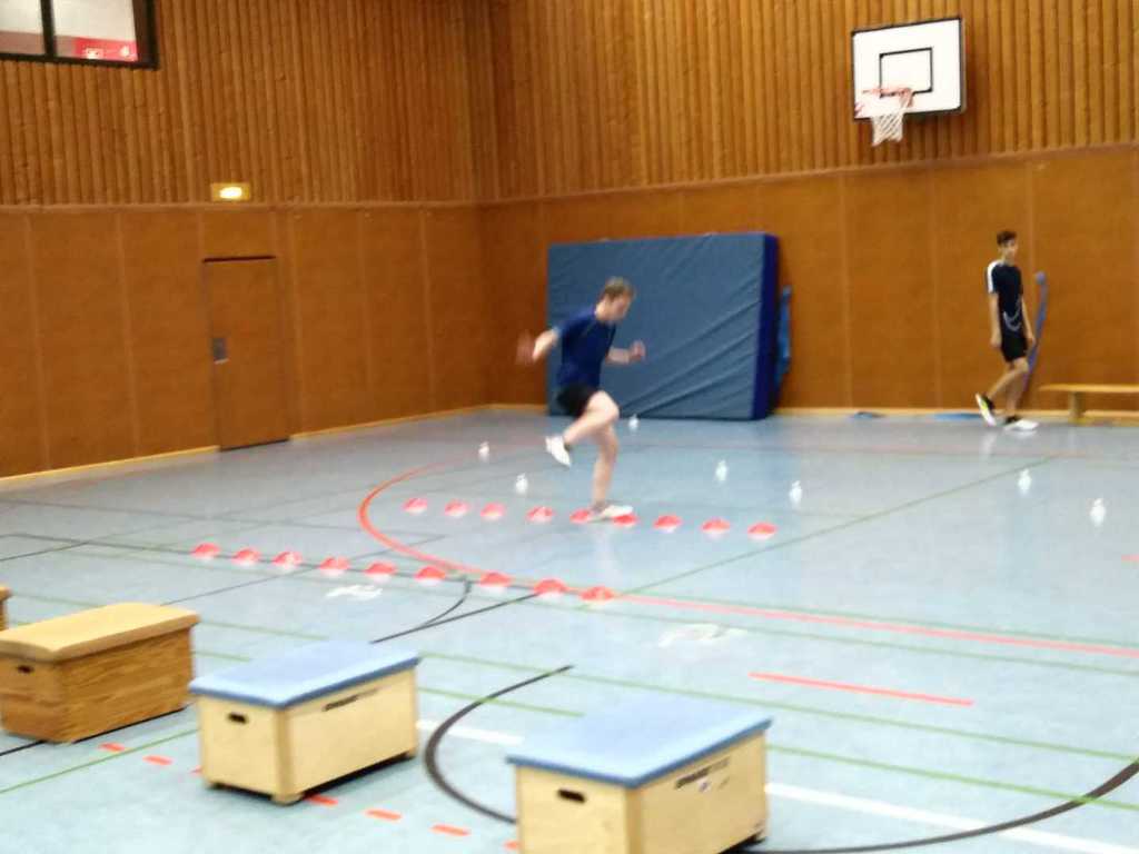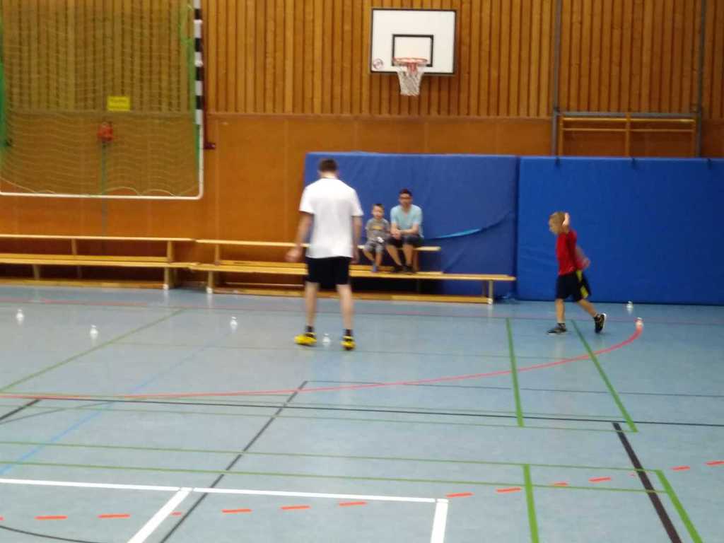 Danach wurden die Netze aufgebaut und auf 4 Feldern ein Spiel im Mini-Mannschaftssystem gemacht. Dies bedeutete es gab zwei Doppel und vier Einzel. Über eine Stunde hatte es gedauert bis alle Spiele durch wahren. Zwei Jugendliche haben in einem Einzel alles gegeben und in drei Sätzen um den Sieg gekämpft. Insgesamt ging das Spiel 3:3 aus. Nach einer kleinen Pause ging es mit einem Parcours weiter, der es zumindest für die kleinen in sich hatte. Los ging es mit Springen über kleine Kästen, dann einmal hüpfen auf dem linken Bein zwischen Hütchen und das gleiche mit dem rechten, dann Ausfallschritte und zum Schluss auch noch Sprinten. Jede Gruppe musste auf Zeit einmal dadurch und wurde erneut von Jonas unterstützt. Nach Strafzeiten und einigen sehr spannenden Diskussionen (weil jede Gruppe gewinnen wollte) kam es zu einem scheinbaren ungleichen Stechen. Der größte lief gegen den kleinsten und dann auch noch mit Medizinbällen (unterschiedlich schwer für die Fairness). Doch waren sich alle ziemlich einig, dass es ein ungleiches Duell ist, was aber die Zeit nicht belegte. Der älteste begann und legte eine Zeit von 20 sek. vor. Doch dann kam der kleine 7 jährige und wurde ziemlich laut von seiner Gruppe angefeuert und schaffte den gleichen Parcours in 22 sek., was einige Bonuspunkte brachte, weil die Gruppe ihn bis zuletzt angefeuert hatte. Zum Schluss wurden noch zwei Partien Völkerball gespielt. Am Ende waren alle ziemlich ausgepowert, hatten aber den Tag über sehr viel Spaß. Nach dem sportlichen Teil kam der gemütliche Teil nach knapp 3,5 Stunden wurde gegrillt.