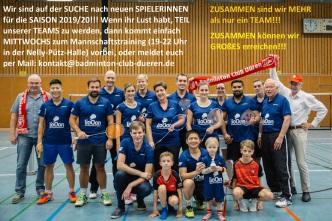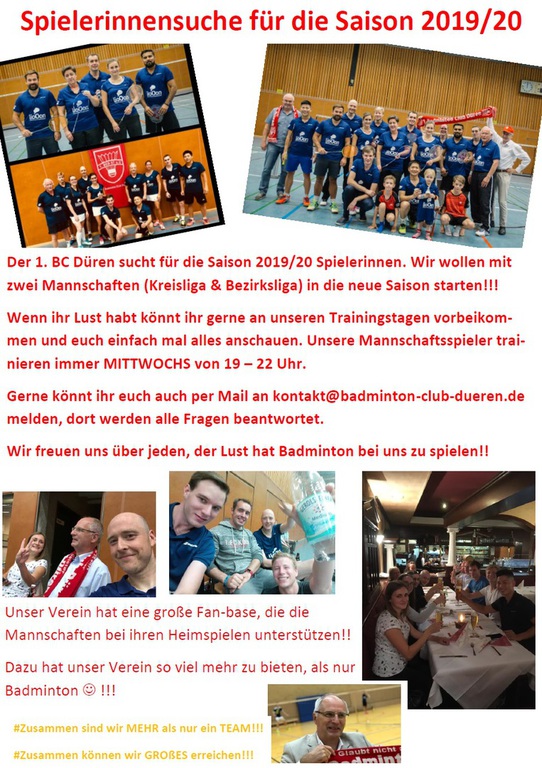 Wer sich jetzt schon für unseren Verein interessiert kann sich gerne bei Jonas Mohr (jonas.mohr@badminton-club-dueren.de) melden. Wir freuen uns auf euch.