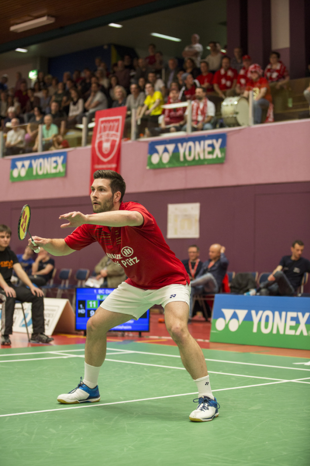 im Hintergrund gucken die Fans oben ganz gebannt auf das Spielgeschehen.