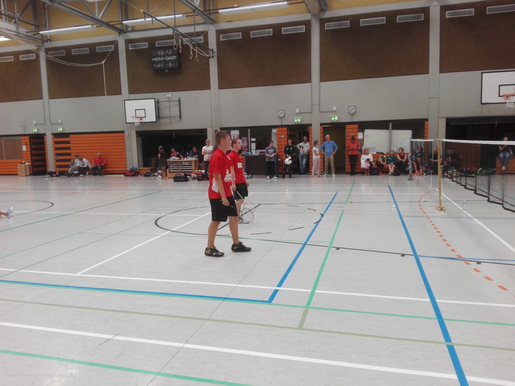 Bereits das erste Doppel (Jean Haffner u. Bastian Neuss vs. Simon Wirtz u. Nils Selmer) zeigte wie schwer es die Mannschaft an diesem Abend haben sollte. Im ersten Satz sah es nach einer klaren Angelegenheit für die beiden Dürener aus. Bastian und Jean dominierten das Spiel und gewannen klar mit 21:14. Doch wie so oft folgte nach einem starken ersten Satz ein etwas schwächerer zweiter Satz. Bastian und Jean machten ungewöhnlich viele Fehler und verloren diesen Satz mit 17:21. Im dritten Satz galt es die Fehler abzustellen, was auch zu Beginn gut klappte, doch nach dem Seitenwechsel ging das ganze wieder von vorne los und die beiden verloren mit 16:21.