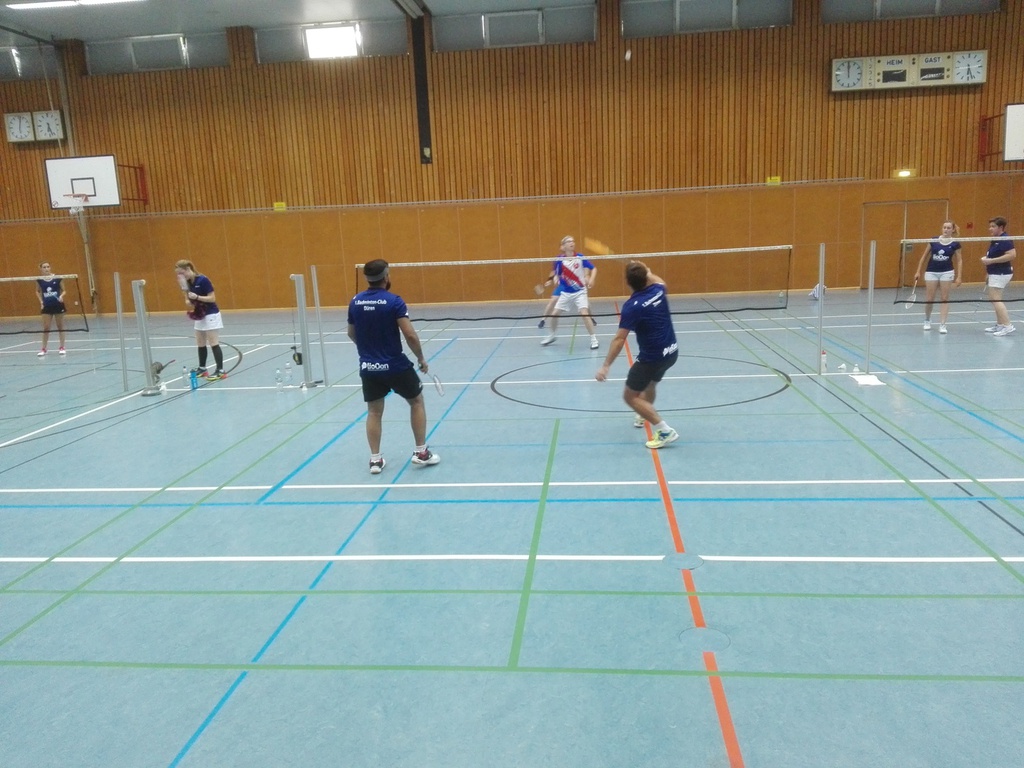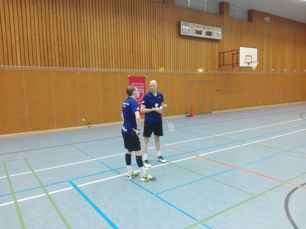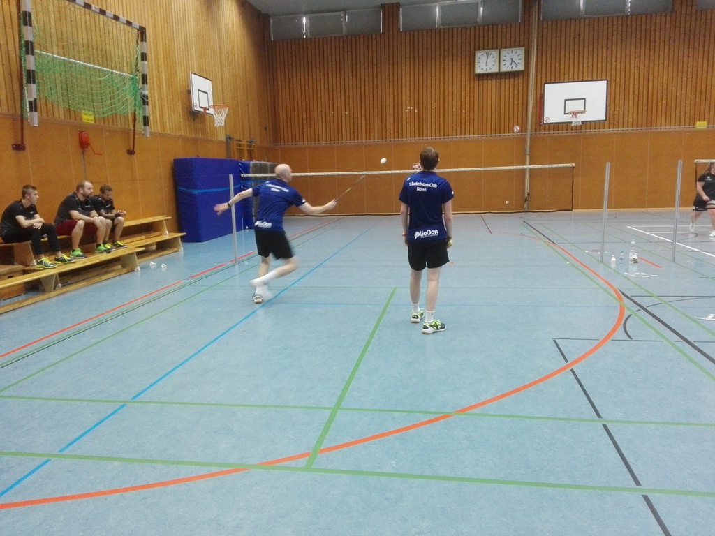 Im ersten Herrendoppel trafen Daniyal Mahmood und Torsten Heinze auf Timo Pralle und Tobias Maß. Im ersten Satz spielten Daniyal und Torsten sehr stark, kämpften um jeden Ball, holten viele Punkte und gewannen mit 21:14. Im zweiten und darauffolgenden dritten Satz zeigte sich die Stärke der Walheimer. Die beiden drehten richtig auf, doch hielten Torsten und Daniyal sehr gut mit. Leider hatten die Dürener in beiden Sätzen nicht das Glück zu gewinnen, sodass sie beide Sätze sehr knapp mit 17:21 verloren. Bei diesem Spiel schien sich wohl Tobias Maß verletzt zu haben, der das zweite Herreneinzel gegen Michael Pütz aufgab, sodass dieses Spiel an uns ging. Auf diesem Weg wünschen wir dem Spieler Tobias Maß gute Besserung.