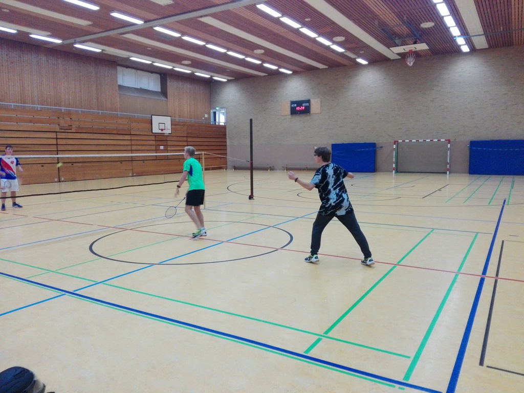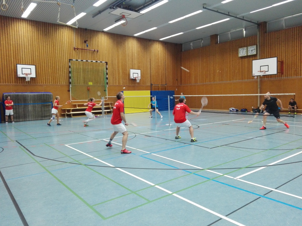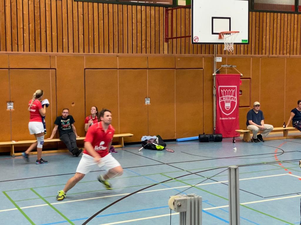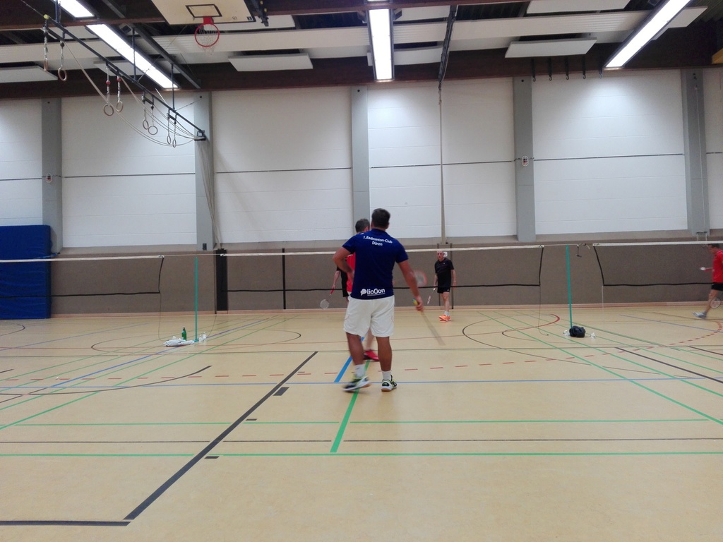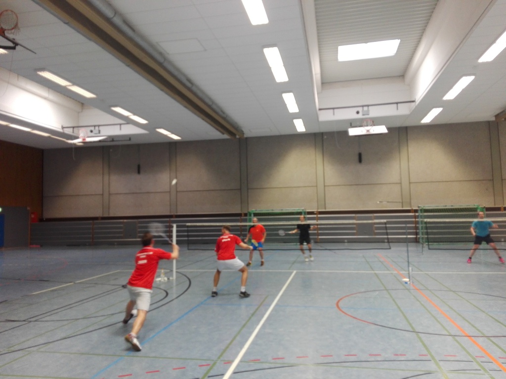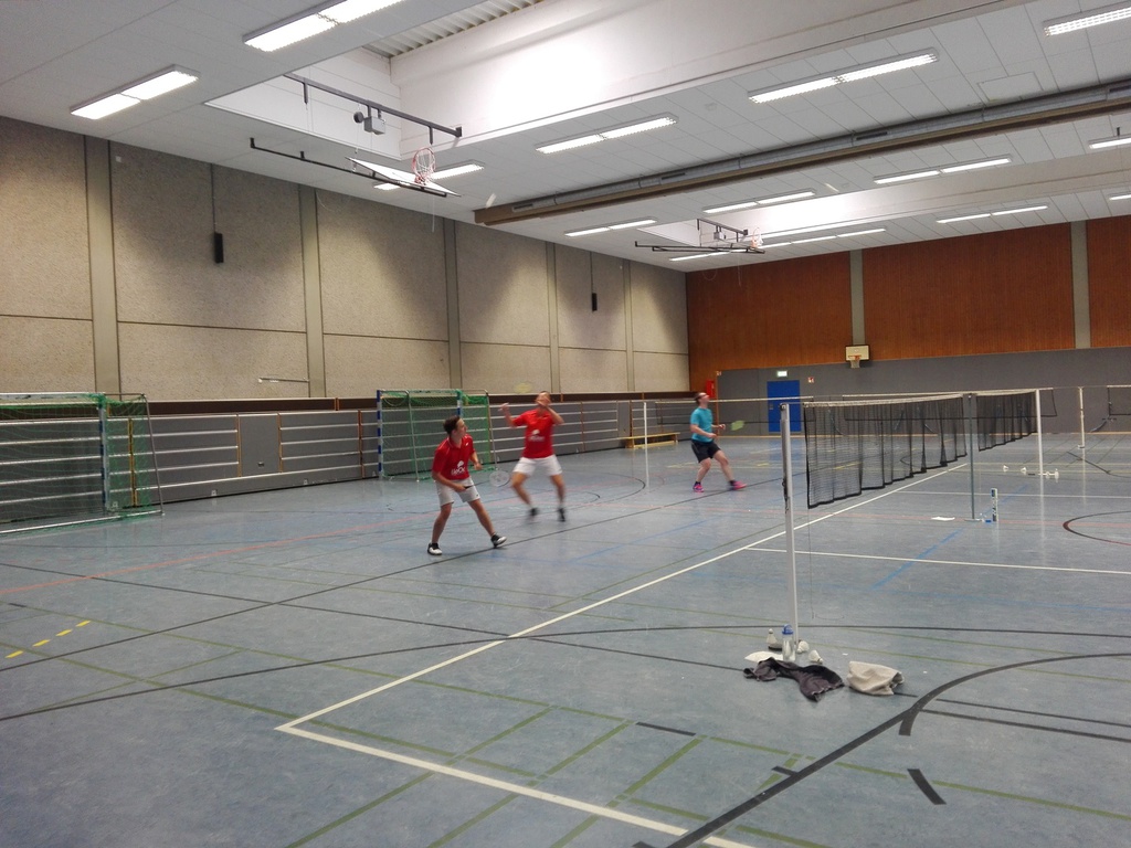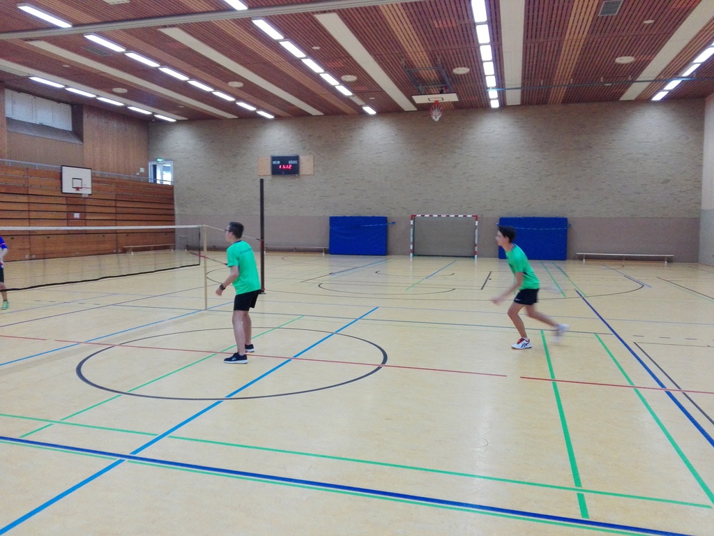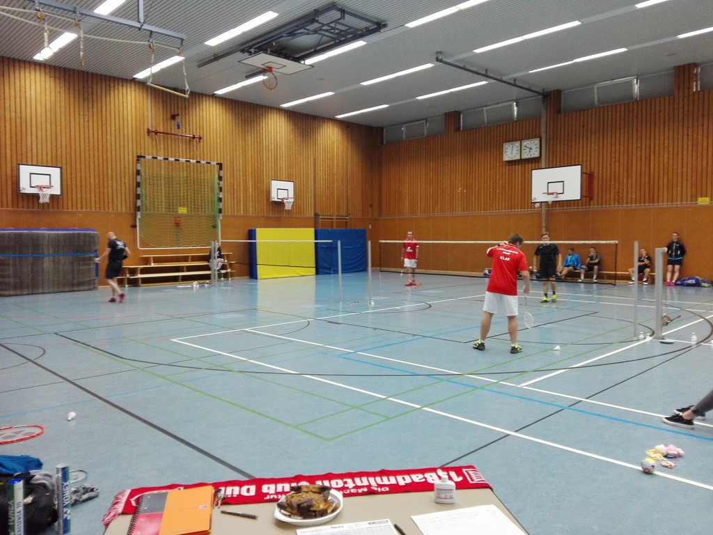 Bereits in den beiden Herrendoppeln ging es hoch her. Im ersten Herrendoppel (Dominik Lindlar u. Florian Esser vs. Christian Niehoff u. Thomas Dikomey) zeigten Florian und Dominik ein starkes Doppel. Im ersten Satz taten sie sich noch etwas schwer, konnten diesen allerdings mit 21:16 gewinnen. Im zweiten Satz gab es keine Spielchen mehr von beiden, sodass sie den Satz souverän mit 21:12 gewonnen haben. Im zweiten Herrendoppel (Ly Xuan Duong u. Frank Pelzer vs. Refik Kabakci u. Ünal Akkurt) wurde es sehr spannend. Ein dritter Satz musste her um eine Entscheidung herbeizuführen. Im ersten Satz hatten es Duong und Frank etwas schwer, weil sie nicht so eingespielt haben. Mit einigen Abstimmungsschwierigkeiten verloren sie knapp mit 16:21. Im zweiten Satz drehten beide richtig auf. Sie zeigten ihr bestes Doppel und gewann so mit 21:14. Der dritte Satz war ein Spiel auf Augenhöhe. Beide Paarungen wollten diesen Satz unbedingt gewinnen. Am Ende setzten sich unsere Herren durch und gewann denkbar knapp mit 24:22.