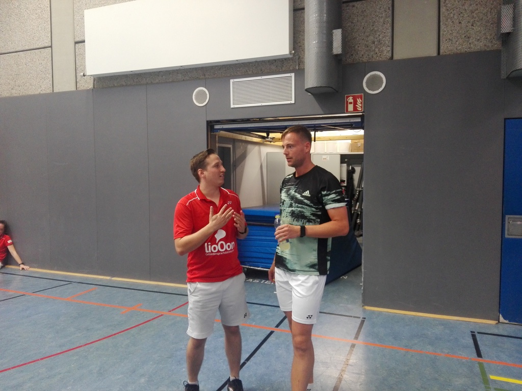 Während das Dameneinzel lief kam es zu einem hochklassigen zweiten Herreneinzel (Benedikt Weidner vs. Frederik Bergs). Dieses Einzel ging ebenfalls über drei Sätze und am Ende gewann derjenige mit der besseren Kondition. Die ersten beiden Sätze waren komplett auf Augenhöhe. Beide kämpften um jeden einzelnen Ball und schoben sich langsam Punkt für Punkt vorwärts. Der erste Satz ging knapp in der Satzverlängerung mit 22:20 an den Gastgeber. Dafür konnte Benedikt den zweiten Satz knapp mit 21:19 für sich entscheiden. Beiden Sportlern sah man an, dass sie nicht mehr konnten. Benedikt sagte bei jeder Gelegenheit, die sich ihm bat, dass er nicht mehr kann und die Bank munterte ihn auf mit dem Satz „dein Gegner kann auch nicht mehr, du schaffst das“! So ging es für ihn in den dritten Satz, wo er sich jeden einzelnen Punkt weiter hart erkämpfte, sein Gegner das hohe Tempo nicht mehr so mitgehen konnte. Benedikt gewann diesen Satz mit 21:12.
