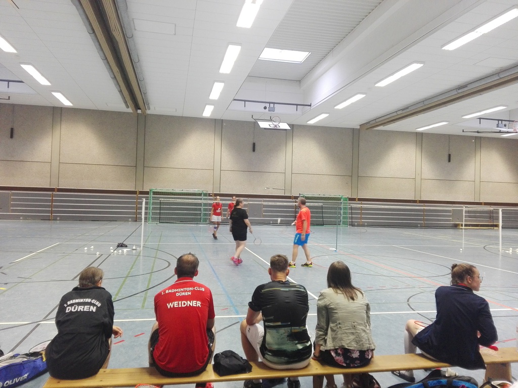 Im ersten Herrendoppel trafen Michael Zymelka u. Dominik Lindlar auf Philipp Hetzer u. Christoph Ervens. Michael und Dominik harmonierten diesmal besser, als beim Doppel am vergangenen Mittwoch. Sie ließen nicht viel zu und holten stark die Punkte. Am Ende konnten sie beide Sätze jeweils mit 21:15 gewinnen. Parallel lief das Dameneinzel (Johanna Lomparski vs. Petra Nepomuck und das dritte Herreneinzel (Maurice Seefeld vs. Ly Xuan Duong) Im Dameneinzel hatte Johanna gegen eine starke Gegnerin leider kaum eine Chance. Im ersten Satz hatte sie Probleme ins Spiel zu kommen und verlor deutlich mit 3:21. Im zweiten Satz spielte die Junge Dürenerin stärker, hatte gute Aktionen und erkämpfte sich 12 Punkte. Duong hatte es in seinem Einzel leichter. Er kannte seinen Gegner sehr genau und kannte auch seine Schwächen. So hatte der Dürener leichtes Spiel und gewann mit 21:10 und 21:14.