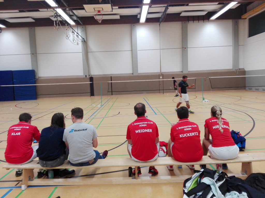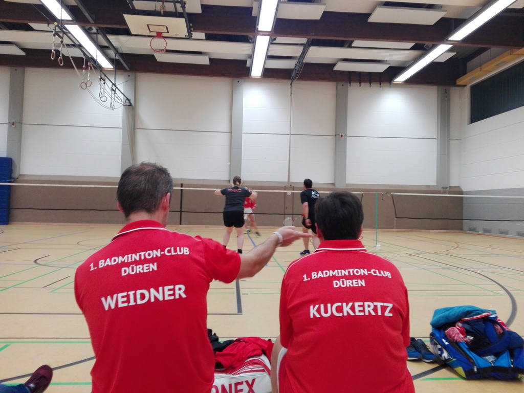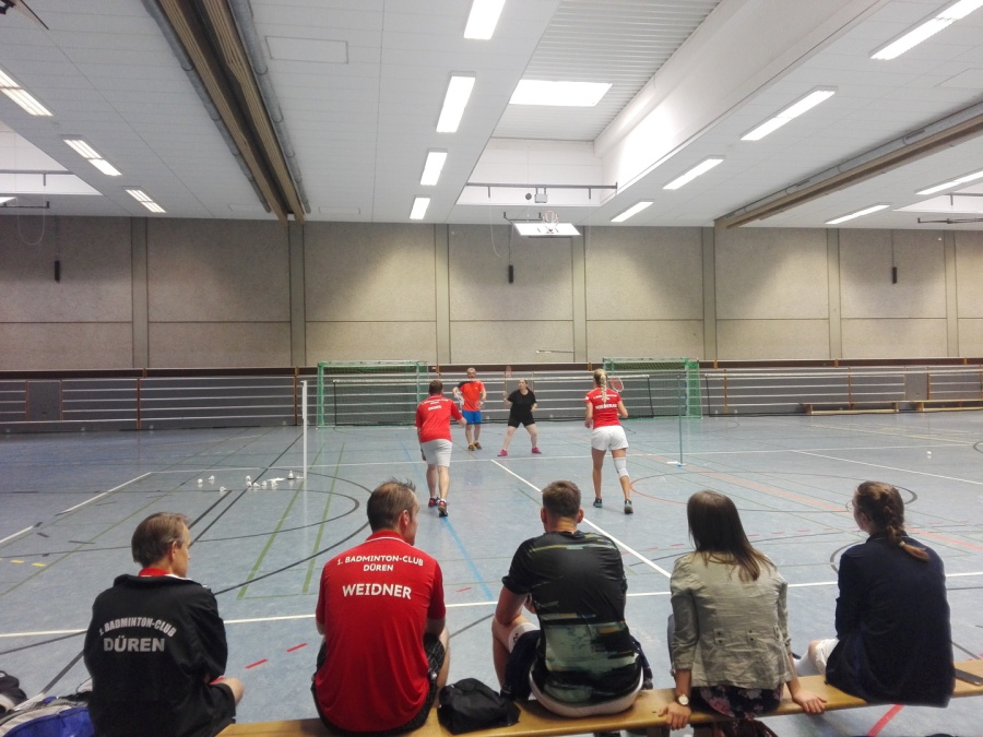 Um 17 Uhr startete die erste Mannschaft des 1. BC Düren ihre Mission Aufstieg beim TSV Hertha Walheim. Los ging es wie gehabt mit den drei Doppeln. Diese konnten jeweils für uns entschieden werden und sorgten für eine gute Ausgangslage für die darauffolgenden Disziplinen (1. HD: Christoph Braun und Florian Esser vs. Tammes Diederich u. Philipp Mostert 21:16, 21:12; 2. HD: Markus Klar u. Torsten Heinze vs. Sergey Shcherbachenko u. Vitus Merx 23:21, 21:9). Im Damendoppel (Stefanie Ferebauer u. Nadine Niederau vs. Isabel Franck u. Hannah Rosner) musste ein spannendes Dreisatzspiel her. Im ersten Satz hatten die Dürener Damen die Oberhand und gewannen mit 21:17. Es folgte ein Satz, wo nicht viel passte und die Gastgeber die Oberhand hatten und diesen mit 21:10 gewannen. Im dritten Satz hatten Steffi und Nadine das Heft des Handelns wieder in der Hand und gewannen am Ende mit 21:15.
