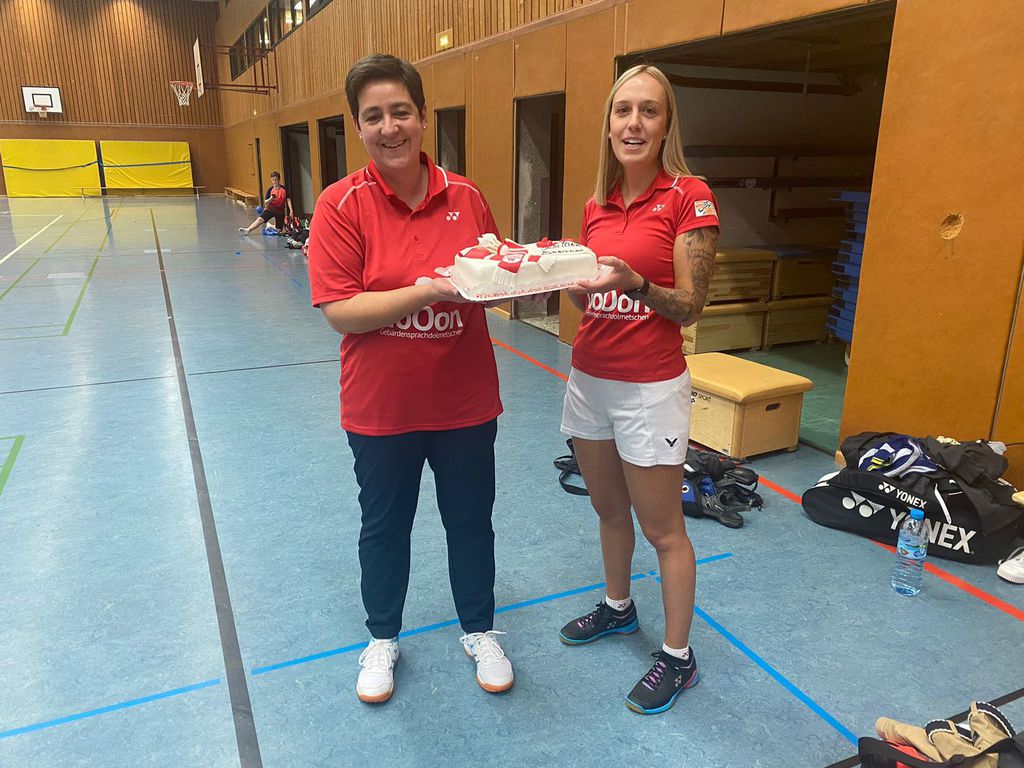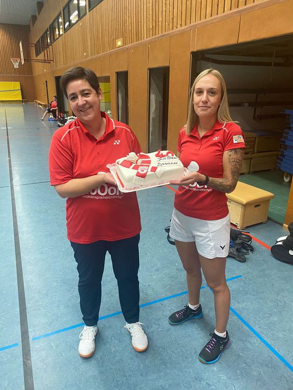 Als erstes wurde ein Jubiläum gefeiert. Die Mannschaft gratulierte Susanne Kuckertz zur 40-jährigen Vereinsmitgliedschaft. 40 Jahre Badminton in Düren, das kann man ausgelassen feiern und am besten feiert man das mit einem ordentlichen Erfolg im Spiel. Und dieser sollte auch kommen.