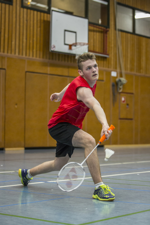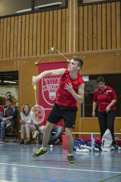 Im ersten Einzel traf Finn Kuhlmann auf Jens Breuer. Finn machte sehr kurzen Prozess mit seinem Gegner. Überlegen und konzentriert gestaltete er sein Spiel und gewann am Ende sehr souverän mit 21:5 und 21:2. Auf die Frage ob er nicht hätte zu null gewinnen wollen antwortete Finn folgendermaßen: „Das macht man nicht das demotiviert den Gegner.“ Das ist eine sehr starke und faire Geste des jungen Düreners.