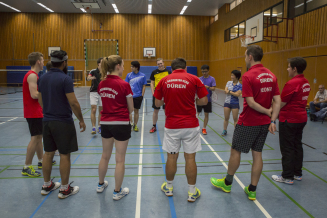 Zunächst jedoch das erste Herrendoppel. Auch hier spielte mit Markus Klar ein Ex-Dürener auf der Seite Eschweilers. Michael Pütz und Daniyal Mahmood spielten also gegen Markus Klar und Ulf Kerkemeier. Wie im Vorbericht auf dieses Spiel angedeutet wurde es das erwartete schwere Spiel. Die Dürener haben im ersten Satz alles gegeben und mussten sich mit 19:21 geschlagen geben. Der zweite Satz ging leider deutlich an Eschweiler mit 14:21.
