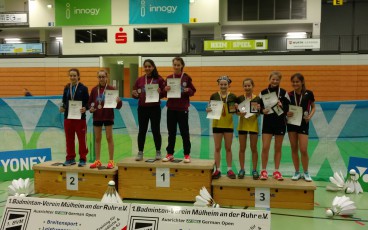 Mit der Teilnahme an der Deutschen U 13 Meisterschaft in Bonn hat Julia eine turbulente Saison beendet, die sie von der Kreisrangliste bis zur Teilnahme am höchsten deutschen Badmintonturnier ihrer Altersklasse führte. Leider zog sie im Einzelwettbewerb gegen Sanchi Sadana aus Hessen (22:24; 23:25) und Victoria Krawiec aus Hamburg (15:21; 20:22) zweimal denkbar knapp den Kürzeren, so dass sie im Einzel nicht über die Gruppenphase hinauskam. Im Doppel warteten nach einem ungefährdeten Sieg gegen die Landesmeister aus Schleswig Holstein Alexandra und Katharina Reimann (21:15, 21:11) im Viertelfinale dann die starken Gewinnerinnen der Südostdeutschen Meisterschaft Mira Hamm und Maya Höfle auf Julia und Yuliana. In einem Spiel auf Augenhöhe konnte sich Julia mit ihrer Partnerin achtbar schlagen (15:21; 17:21) und so erhobenen Hauptes aus dem Turnier verabschieden. Dass es für Julia auf nationaler Ebene gegen Spielerinnen, die nahezu alle ihren jeweiligen Landeskadern angehören, sehr schwer werden würde, war zu erwarten gewesen. Nicht erwartet hatte Julia, dass ihre Leistungen offensichtlich auch den Landestrainer des BLV so überzeugt haben, dass er sie für das Jahr 2018 in den Landeskader NRW berufen hat. Nach einer Saison, die auch hinsichtlich der Trainingsbedingungen nicht immer ganz einfach war, freut sich Julia, dass ihr mit den Leistungsstützpunkten des BLV nun optimale Trainingsmöglichkeiten für ihren geliebten Sport zur Verfügung stehen. Auch wenn man sie beim BC Düren in Zukunft daher seltener sehen wird, die gnadenlose Ballmaschine ihrer ehemaligen Dürener Jugendtrainerin wird Julia immer in Erinnerung bleiben (und in den Beinen).