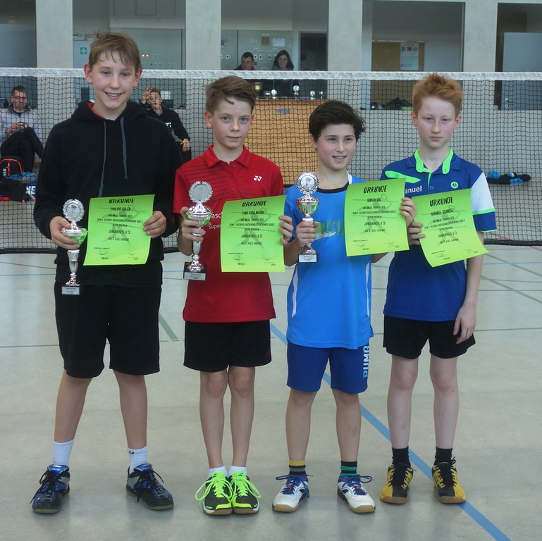 Maximilian Gröbe startet ebenfalls im U13er Feld und erreichte dort den 1. Platz für. Er gewann alle 5 Spiele. Die ersten 4 gewann er jeweils mit 21:5 und im Finalspiel konnte Max mit einem 21:10 Erfolg vom Feld gehen.