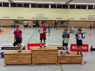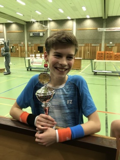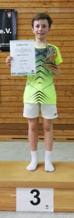 Finn startete in Odenthal zum ersten Mal in der Altersklasse U15. Die ersten beiden Runden könnte Finn problemlos für sich gestalten und zog damit ungefährdet ins Halbfinale ein. Leider ging das Halbfinale ähnlich deutlich verloren, wie die zwei Runden vorher gewonnen wurden. So kam es für Finn zu einem spannenden Spiel um Platz 3 gegen seinen ehemaligen Doppelpartner aus Refrath. Der erste Satz ging recht deutlich mit 21:12 an Finn, der zweite Satz fand dann fast ohne Finn statt und ging mit 4:21 verloren. Von diesen beiden Sätzen recht unbeeindruckt spielten beide einen tollen dritten Satz, der lange ausgeglichen war. Erst nach der Satzpause beim stand von 11:10 konnte finn sich auf 18:13 absetzen und diesen Vorsprung ins Ziel bringen. Damit könnte sich auch Finn einen Pokal für den dritten Platz sichern.
