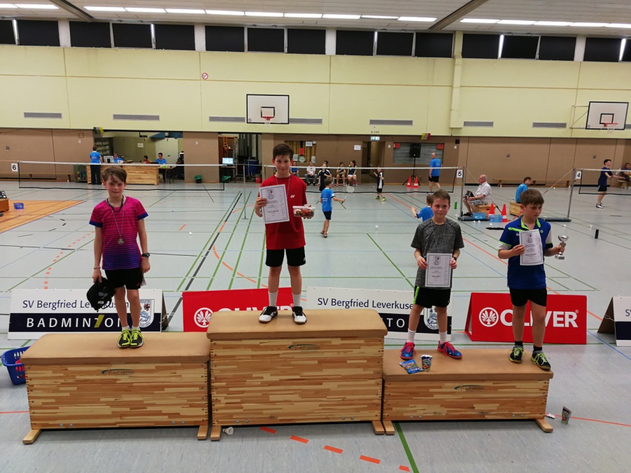 Los ging es am Samstag für Mattis mit dem Einzel U9. Mattis könnte sich in seiner Gruppe gegen Gegner aus Lützenkirchen und Mülheim durchsetzen und auch im Viertelfinale könnte Mattis nach zwei Sätzen gegen einen weiteren Mülheimer das Feld erfolgreich verlassen. Im Halbfinale kam es dann zum Duell mit seinem Doppelpartner Nils aus Refrath. In beiden Sätzen lag Mattis schnell deutlich zurück und konnte trotz einer Steigerung nichts mehr am Verlust des Spieles ändern. Im Spiel um Platz drei könnte Mattis dann nochmal ein starkes Spiel zeigen, ließ seinem Bonner Gegner keine Chance und konnte mit 21:7 Und 21:10 das Spiel für sich entscheiden.